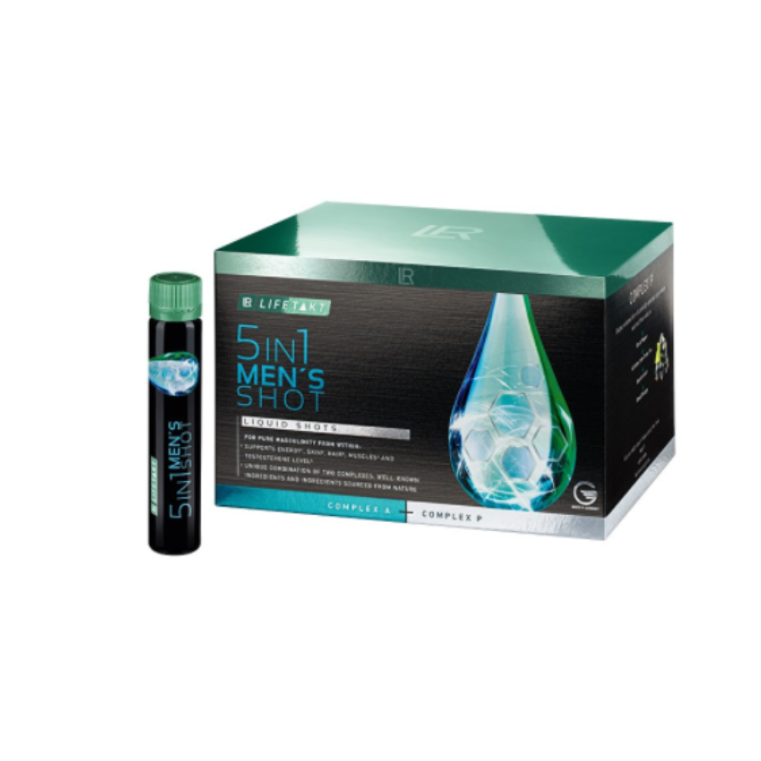 Boostez votre énergie et votre vitalité avec le 5 in 1 Men's Shot de LR Lifetakt. Ce complément innovant combine 5 actions essentielles : énergie durable, peau saine, cheveux vigoureux, muscles renforcés et protection préventive. Formulé avec des ingrédients naturels et scientifiques comme le collagène, la L-arginine, et des minéraux essentiels, il répond aux besoins spécifiques des hommes modernes. Sans gluten, lactose ni colorants artificiels. Essayez-le dès aujourd'hui pour révéler votre puissance masculine ! De plus ses capsules prêtes à l'emploi sont facilement transportables. Ouvrez et buvez tout simplement!!!